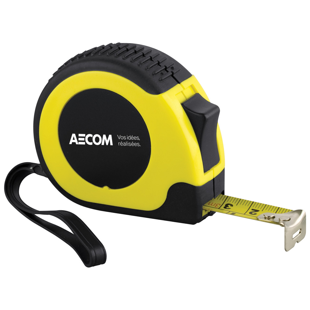 FRRuban à mesurer de 10 pieds. Mesures impériales et métriques. Boitier en caoutchouc. Dragonne robuste en plastique. Bouton pressoir sur le côté barre le ruban en place. Pince de ceinture en métal à l'arrière. Dimensions : 2.375" H X 2.688" W